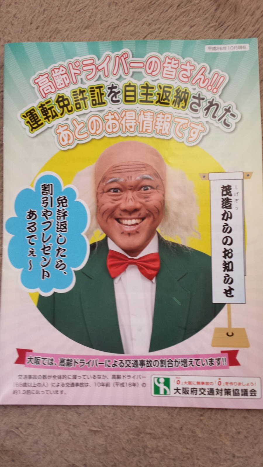 先日、運転免許の更新のため、警察署に行ってきたのですが、交通課のあちこちに、吉本新喜劇の茂蔵(しげぞう)さんの、インパクト強すぎる『運転免許返納』についてのポスターが(笑)