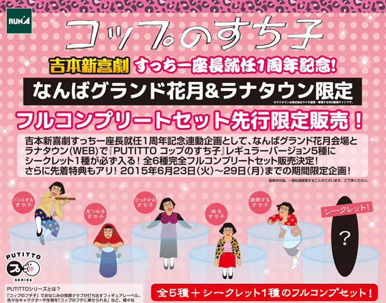 で、お向かいにある、吉本新喜劇を上演している『なんばグランド花月』では、その時丁度、うちのチビの大好きな「すち子」の、『すっちー座長就任・1周年記念公演』をしていて、『コップのフチ子』ならぬ、『コップのすち子』の限定販売予約も受け付けていました。