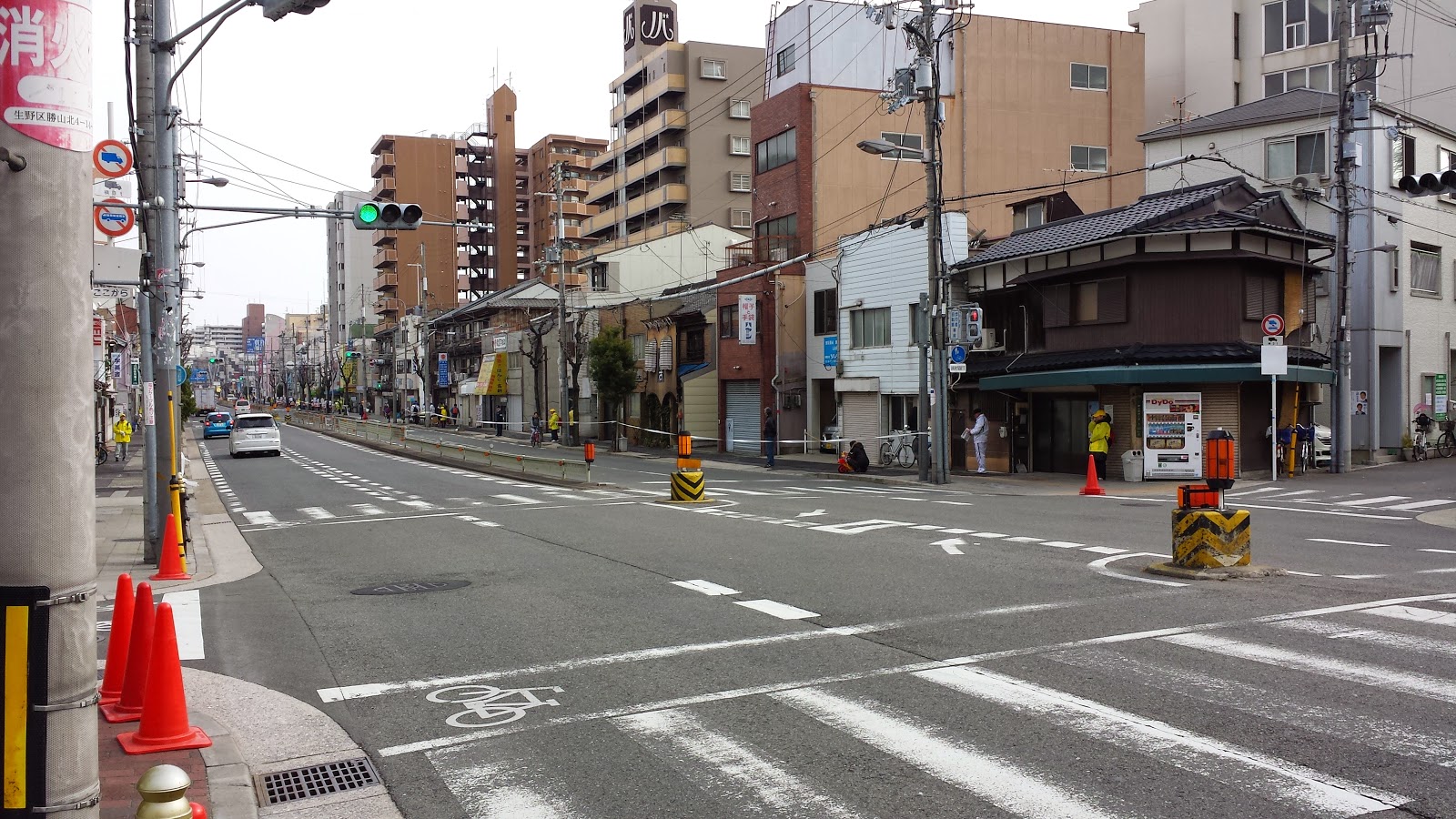 長居のスタジアムを出て、平坦な直線コースが続く中、ここにきて少しだけアップ・ダウンがあります。マラソン・コースが、微妙に坂になっているのが分かるでしょうか。(写真:1枚目、御勝山古墳~大池橋交差点、2枚目、御勝山古墳~桃谷交差点)