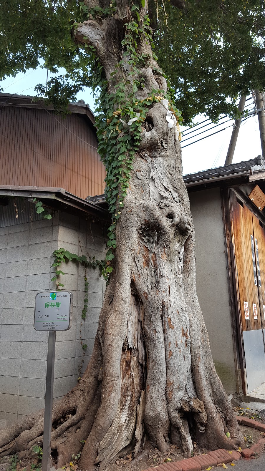 そんな中、お地蔵さまや、地車のガレージの近くに、注連縄が巻かれた大きな樹を見つけたので、そばにいってみると、こんな所にまさかの『大阪市・保存樹』。