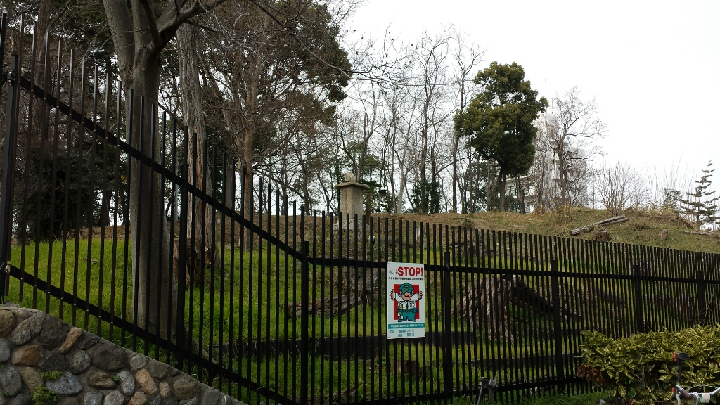 「今年の大河ドラマ『真田丸』にも、もしかしたら出てくるかも」な、大坂冬の陣で徳川秀忠の本陣が置かれた『御勝山古墳』です(白バイの人の後ろの丘が古墳部分)。