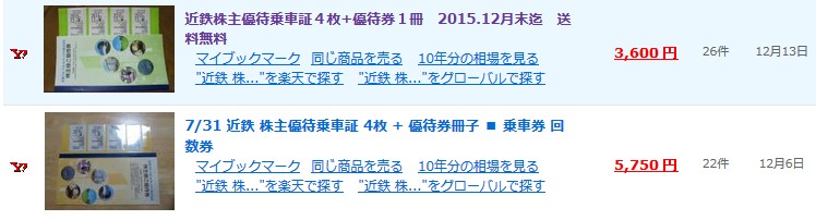 上記の写真のように、2015年12月末で期限が切れる乗車券が『4枚で3600円』、2016年7月末で期限が切れる乗車券が『4枚で5750円』で、12月中旬に落札されています。