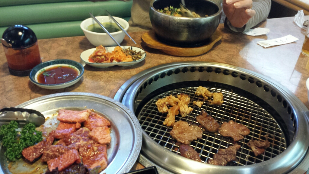 定食には、サッパリ美味しい「ナムル」、韓国の「ゴマメ」、「サラダ」と「白御飯」、そして生のお肉「バラ・タン・ハラミ・上ミノ」が入っていて、ボリューム満点でした。