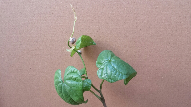 お友達のお庭に咲いたアリストロメリアをいただいたら、蔓がからまっていました。ハート形のかわいい葉っぱなので単独で長めのグラスに入れています。名前が知りたくて「知恵袋」に投稿したところ「長いもの仲間」とお返事いただきました。ちゃんとした名前が知りたくて、いろいろ検索しておりましたら、こちらにたどり着きました。大変興味深くまた楽しく読ませていただきました。葉っぱは長いもにそっくりですが、対生でもなくツルは時計回りのようです。まだまだ特定はできていませんが、とても参考になりました。