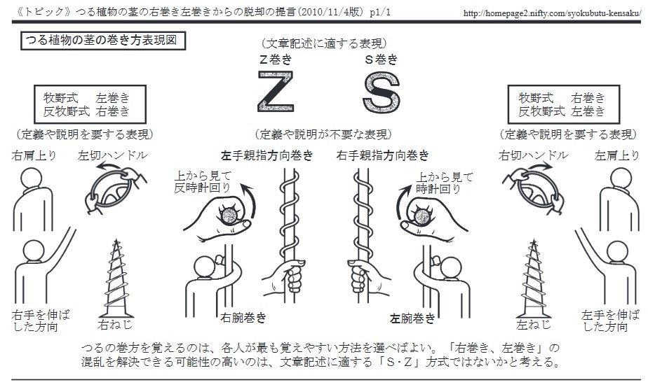 蔓の巻き方の表現については、やはり、表現の違いや、意見がいろいろあって、全国統一の表現がないようなのですが、『Z巻き』『S巻き』という、右・左を基準にしない分け方の指針があることを知りました。