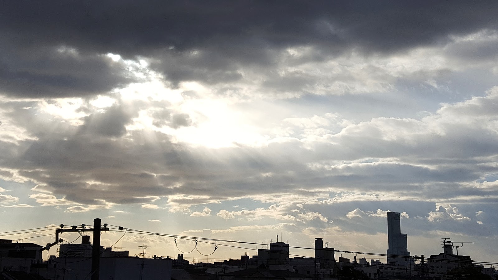 夕暮れの雲間から、陽が差し込んでいて、阿倍野ハルカス(右下の高層ビル)を照らしていて、とってもキレイだったんですが、スマホの写真では、建物が真っ黒になってしまいました(笑)
