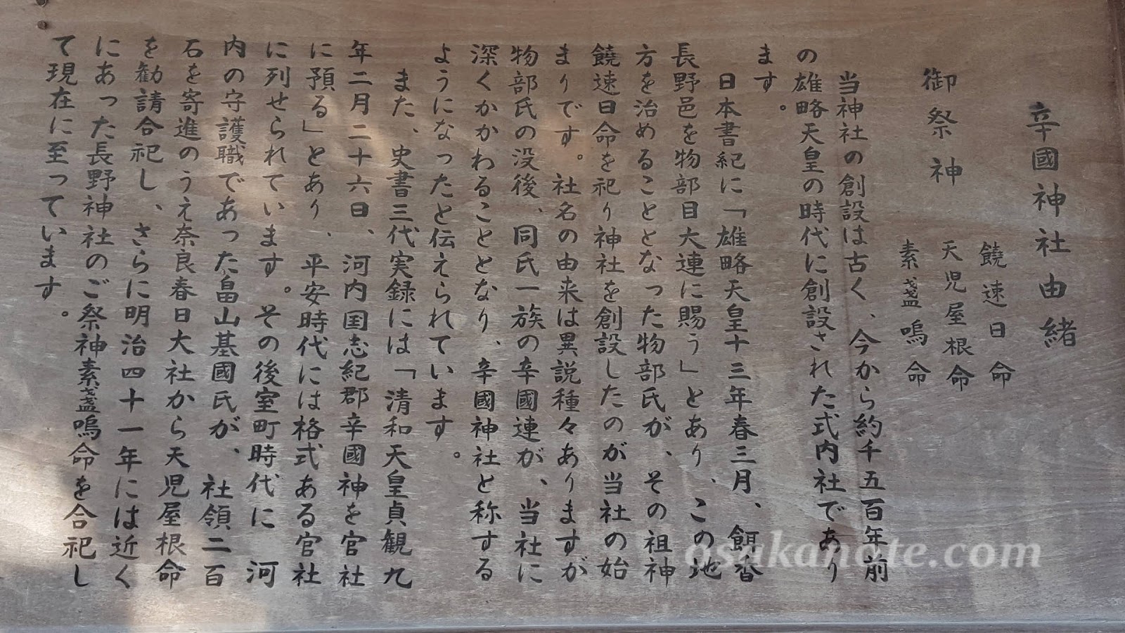 ほか、春日大社の天児屋根命(アメノコヤネノミコト)、長野神社の素戔嗚命(スサノオノミコト)が、後に合祀され、現在に至っています。
