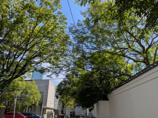 一心寺さんを出て、塀沿いに咲くジャカランダを鑑賞しつつ四天王寺方面に戻ります。