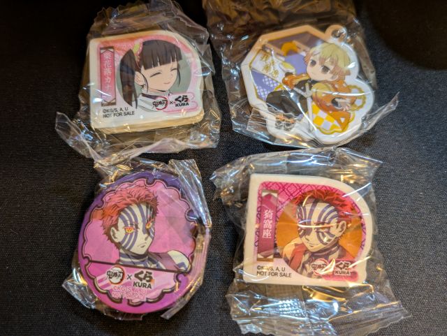 猗窩座のバッチと消しゴム、善逸のキーホルダー、カナオの消しゴムです。