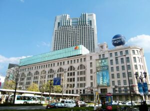 高島屋の建物と、南海なんば駅(後ろの高層ビルはスイスホテル南海)。