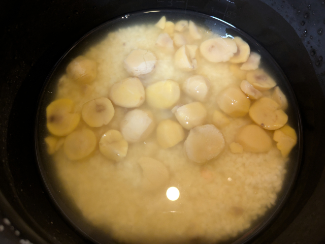 2合のお米に栗の袋と出汁の袋の中身を入れて一緒に炊きます。