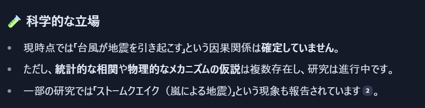 こういう肌感覚の域を出ない仮説は、科学的に証明されていないが故に、公に台風と地震の同時発生の際の対策をしよう、みたいな流れにならないのが残念ですね。