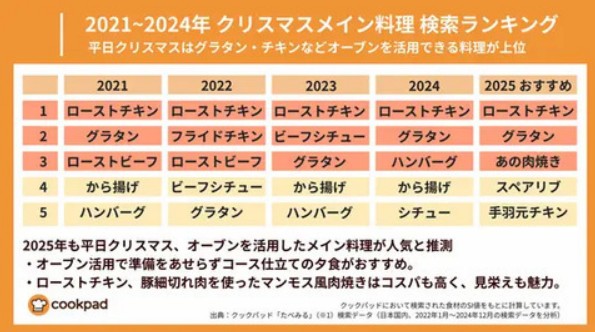 クックパッド調査によると、2025年のクリスマスメイン料理検索ランキングは、1位ローストチキン、2位グラタン、3位あの肉焼きでした。