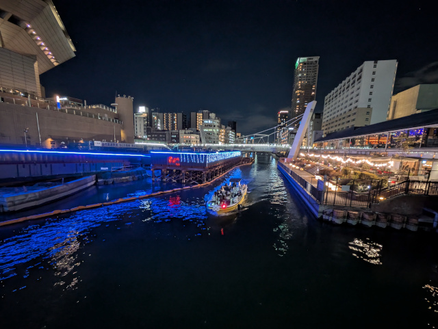 道頓堀川の上の青いネオンに囲まれた場所には湊町船着場があって、ここは『とんぼりリバークルーズ』という遊覧船のUターンポイントのようです。