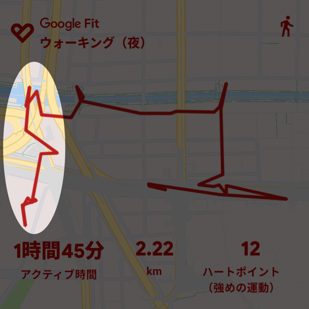 今回、全行程が1つのウォーキング記録になってしまって、正確な距離や歩数が出ませんでした(汗)
