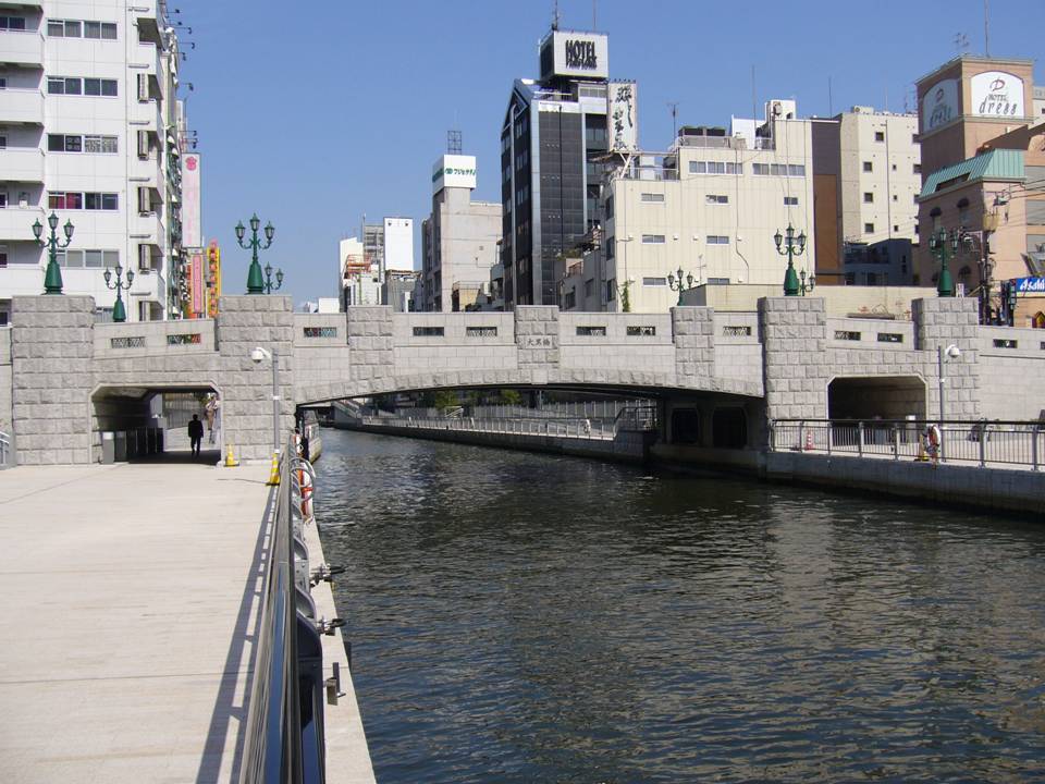 道頓堀川の上流側におしゃれな石造りの橋が見えたので、そこを目標に歩きました。